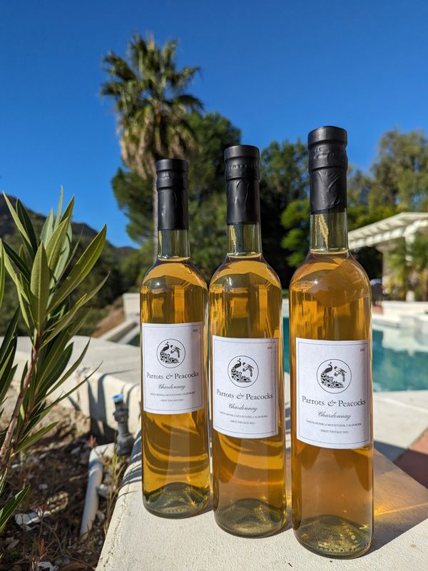 So that's why we're Parrots and Peacocks. The grapes are all grown here locally, on the tough and rocky soils of the Santa Monica Mountains, blessed with near-endless sunshine and a few cool mornings where the fog drifts in from Malibu to cool things down and remind us all that the Pacific Ocean is only a few miles away on the other side of the ridge.
