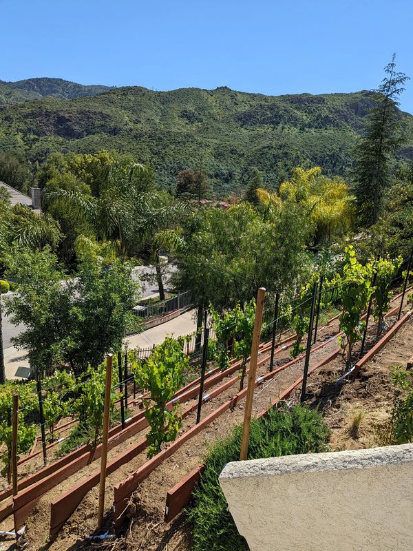 So we needed to install retaining walls and walkways. We built these by hand, using treated wood, and put in stairs as well. This became a pretty ambitious family project and many spare hours (and days) went to build out the basic network of walkways and stairs, dig holes, install irrigation and plant the vines.