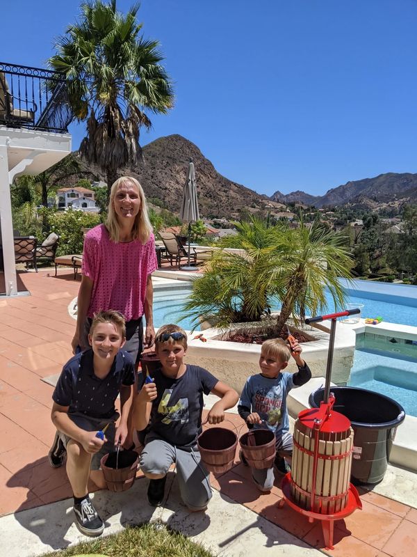 Against all odds (and rational advice) we decided to harvest our first batch the year after planting. In mid-August of 2022, we got the required harvesting tools - buckets for picking, a presser, and carboys for fermenting, racking and aging. This was now decidedly a family affair and the kids were very invested in the process (particularly in picking and testing the grapes for flavor!)